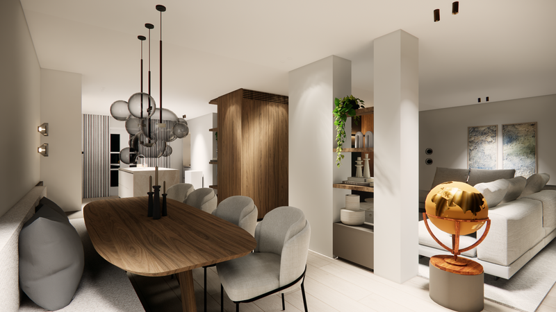 Tijdens de het ontwerp is er gekozen om gehele begane grond open en luchtig te maken. het nieuwe concept was: één grote open ruimte waar men in leeft. Deze ruimte is voorzien van een moderne sfeervolle leefkeuken, eetkamertafel en een zitgedeelte met uitzicht op beide tuinen.